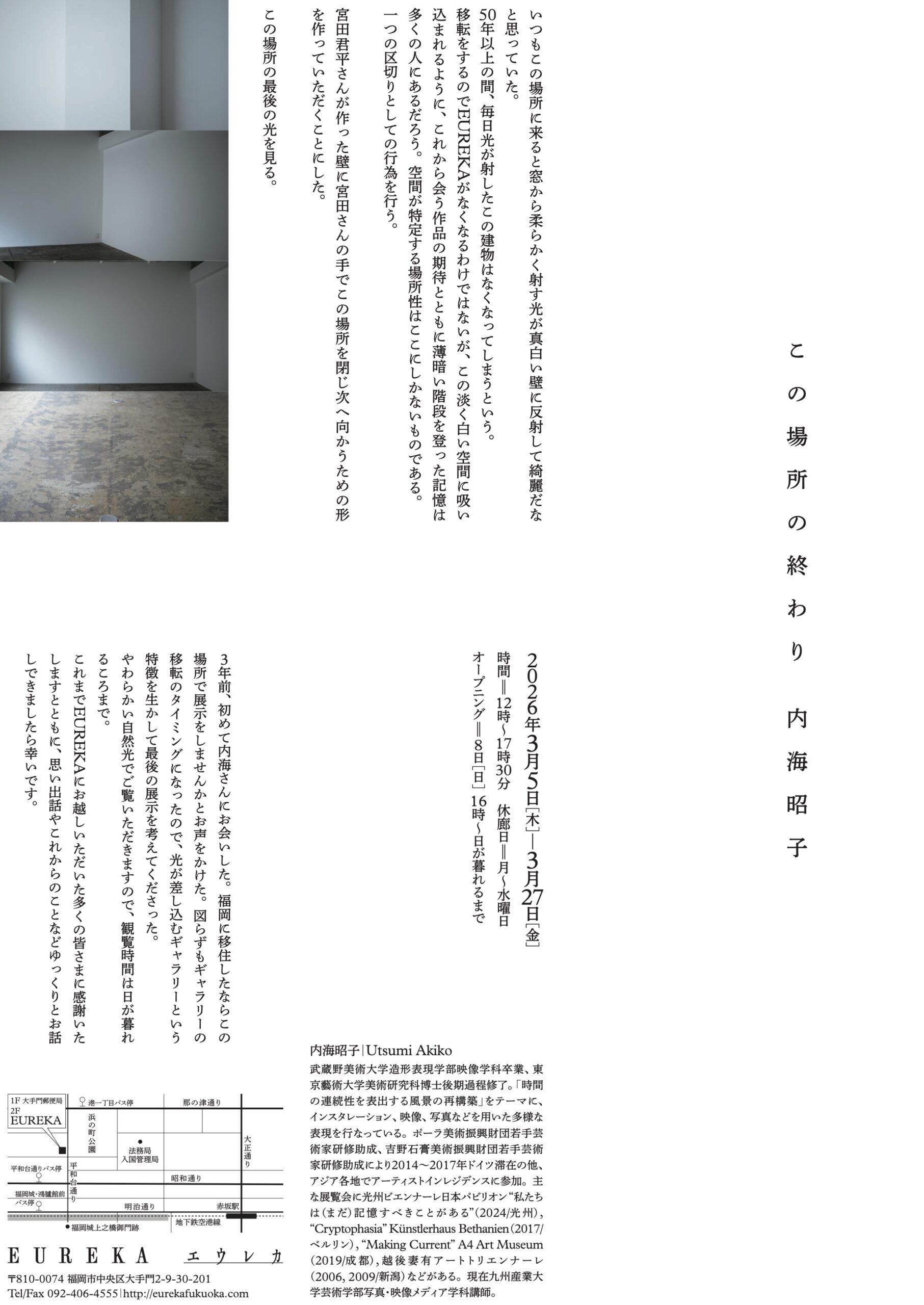 このたびEUREKAでは、2026年3月5日から3月27日まで、現在福岡を拠点に活動している美術家・内海昭子さんの個展「この場所の終わり」を開催いたします。