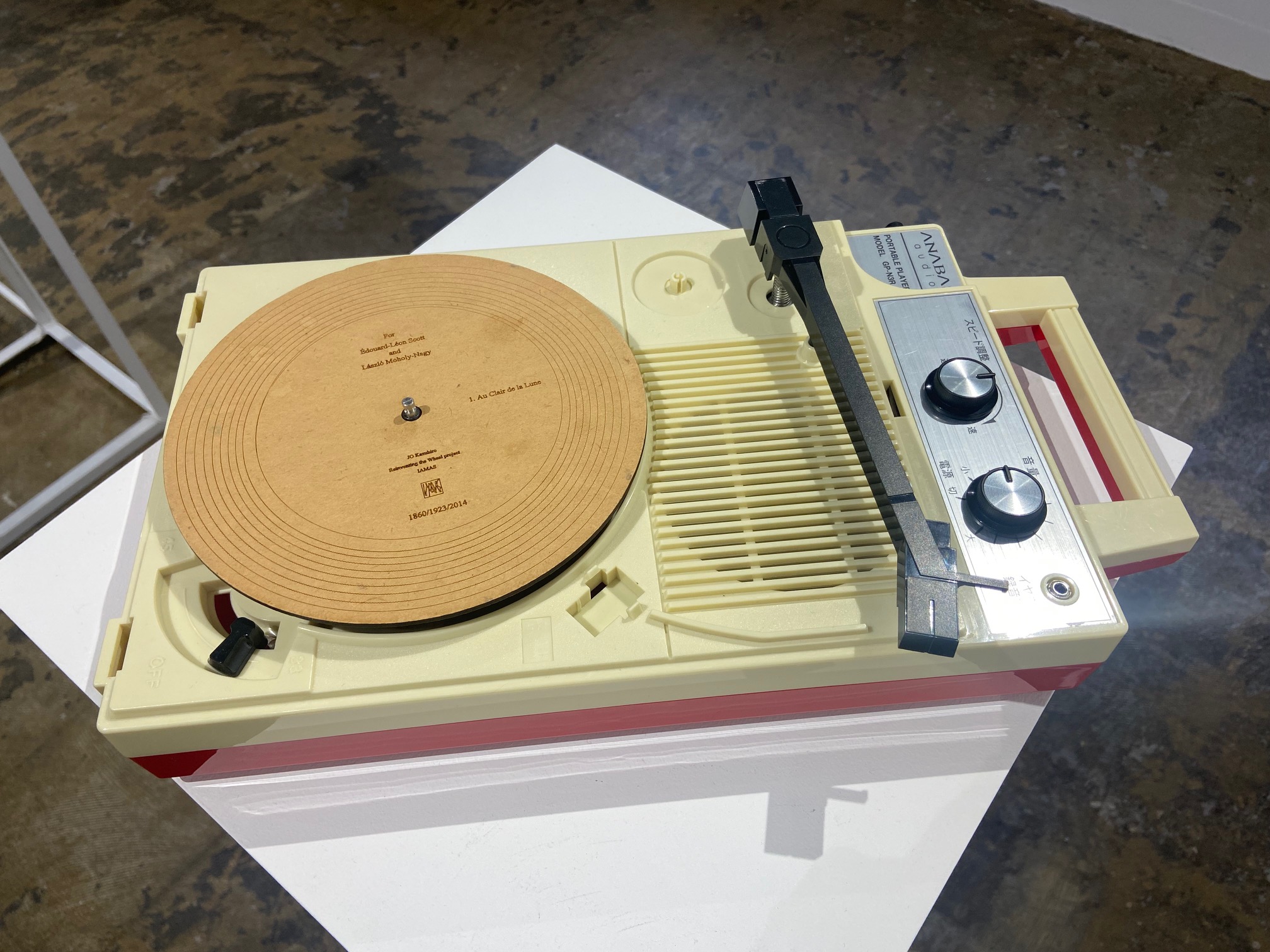 その変遷を示す今回の展示では、いずれの作品においても、1860年にフランスの発明家レオン・スコットが記録した(現段階で)人類最古の録音と言われるフランス民謡の「月の光に」<Au Clair de la Lune> をモチーフに、その楽譜から周波数を計算し、対応する波形を素材の表面に水平方向の溝として刻んでいる。それらの溝からは、計算機上で表された同一の「信号(シグナル)」に基づきながらも、各々の素材による「雑音(ノイズ)」にその表れが委ねられた音が生み出される。