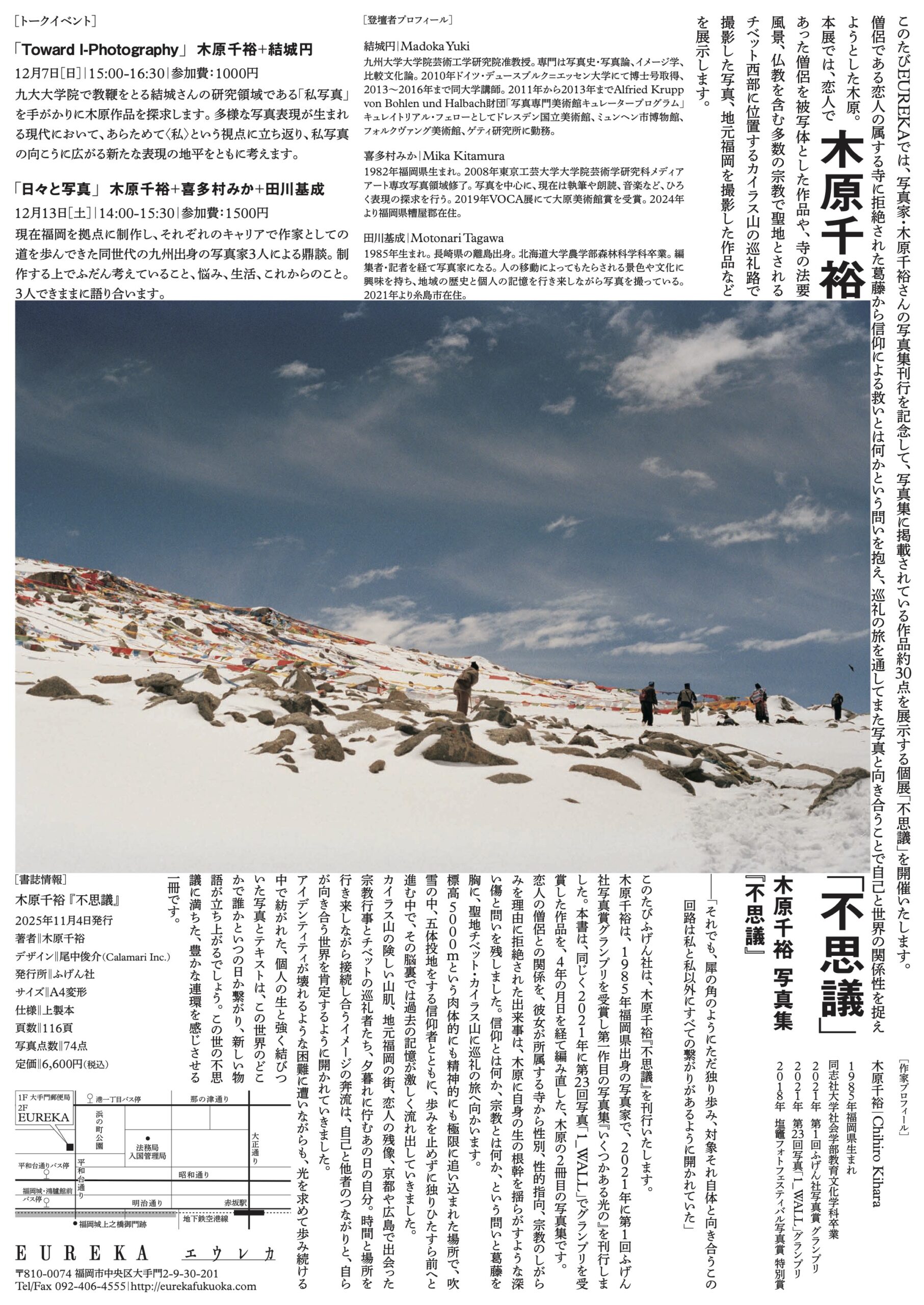 僧侶である恋人の属する寺に拒絶された葛藤から信仰による救いとは何かという問いを抱え、巡礼の旅を通してまた写真と向き合うことで自己と世界の関係性を捉えようとした木原。本展では、恋人であった僧侶を被写体とした作品や、寺の法要風景、仏教を含む多数の宗教で聖地とされるチベット西部に位置するカイラス山の巡礼路で撮影した写真、地元福岡を撮影した作品などを展示します。